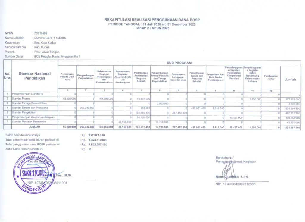 Seluruh penggunaan dana telah dilaksanakan sesuai dengan petunjuk teknis (Juknis) pengelolaan dana BOSP dan telah melalui proses verifikasi internal. SMK Negeri 1 Kudus berkomitmen untuk terus mengelola anggaran pendidikan secara transparan demi peningkatan mutu layanan pendidikan.